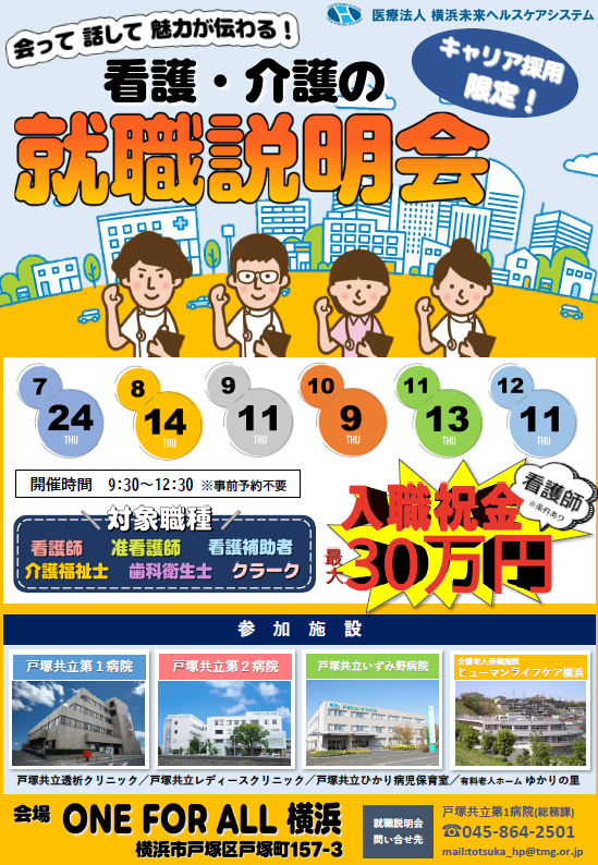 横浜未来ヘルスケアシステムではキャリア採用限定の看護職・介護職の合同就職説明会を下記の日程にて開催いたします。
