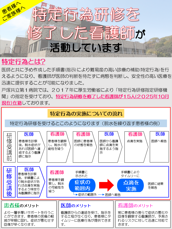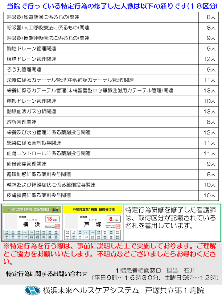 【患者様・ご家族様へ】特定行為研修を修了した看護師が活動しています 投稿日 2025年10月8日 著者 suzuki-staff カテゴリー 病院からのお知らせ 投稿 LINE 「特定行為研修を修了した看護師が活動しています」ポスターはこちら(PDF) 戸塚 戸塚共立第1病院