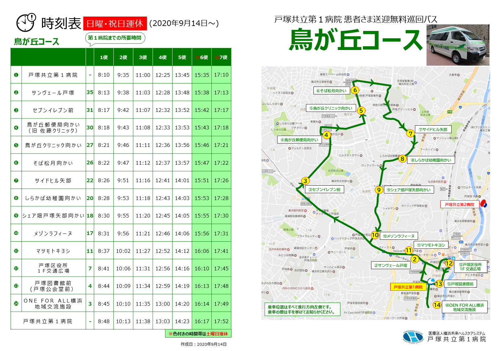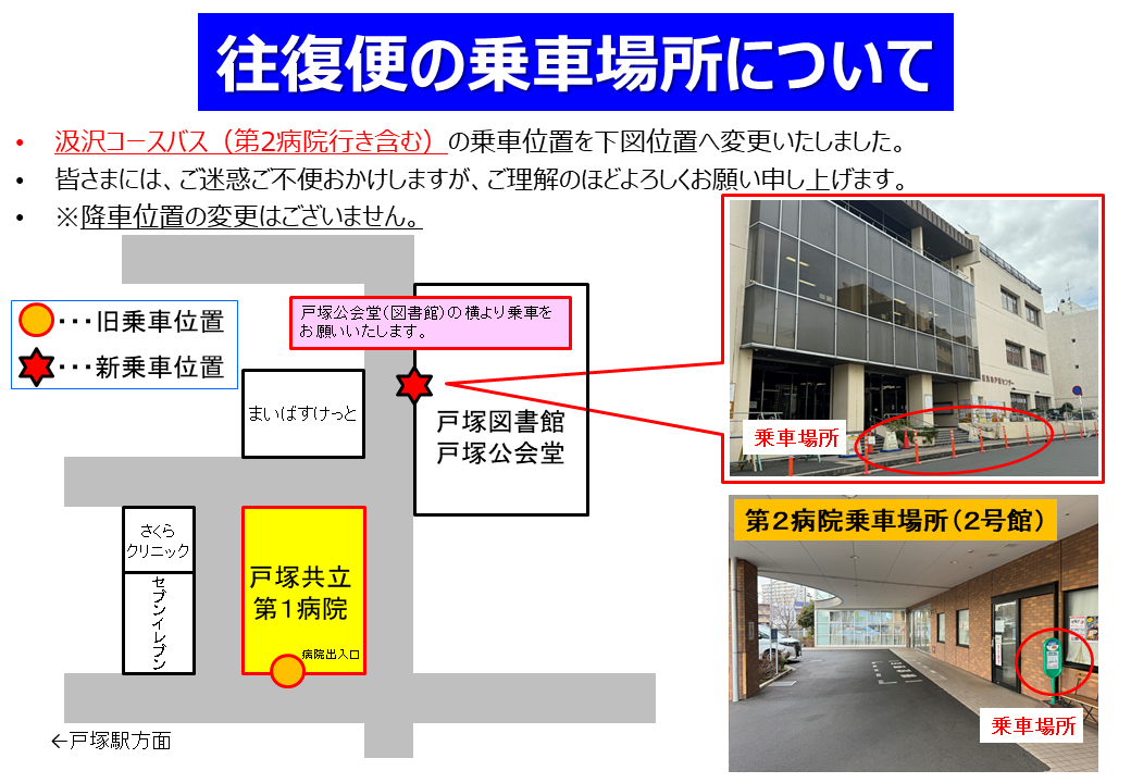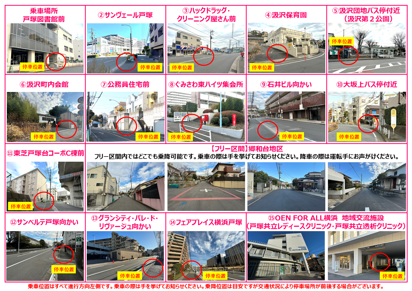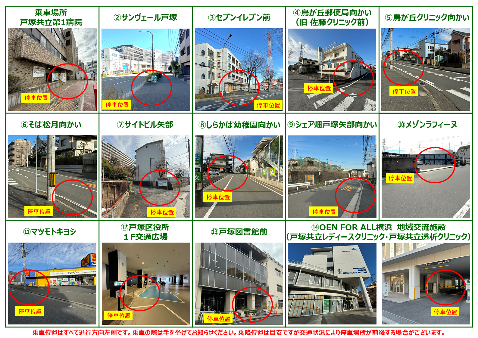 - 汲沢コース(往復便含む)の車両は戸塚図書館前(戸塚公会堂)から発車、鳥が丘コースの車両は戸塚共立第1病院から発車となります。お間違えのないようご注意ください。
