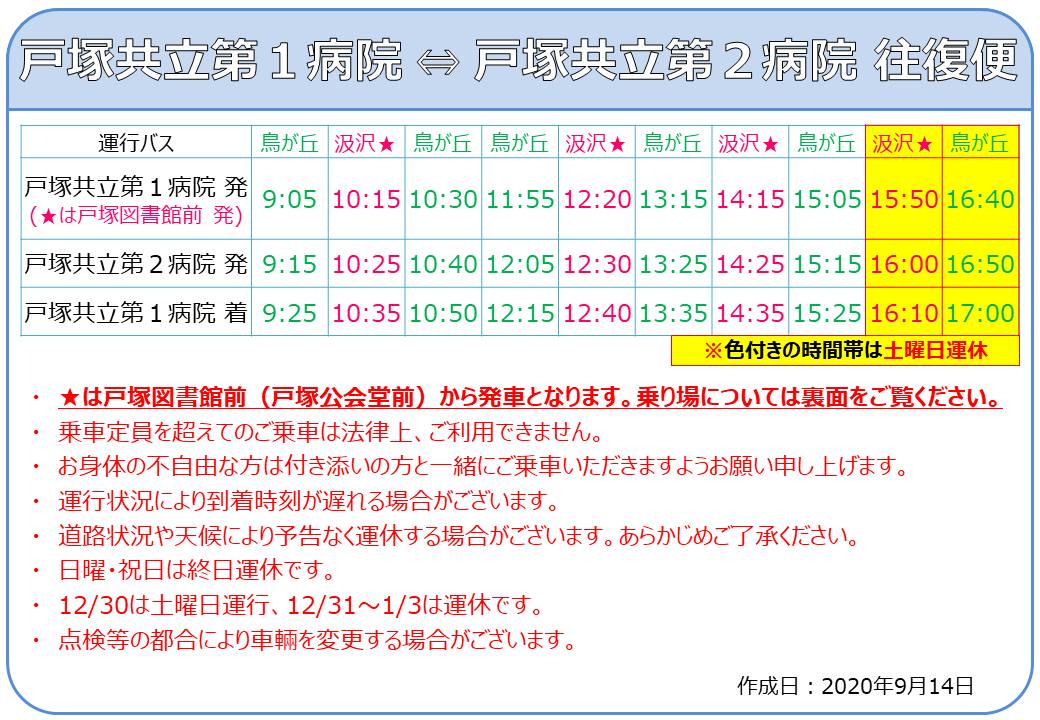 - 土曜日、12月30日の往復便は戸塚共立第1病院15時05分発が最終(15時50分・16時40分は運行いたしません)となります。