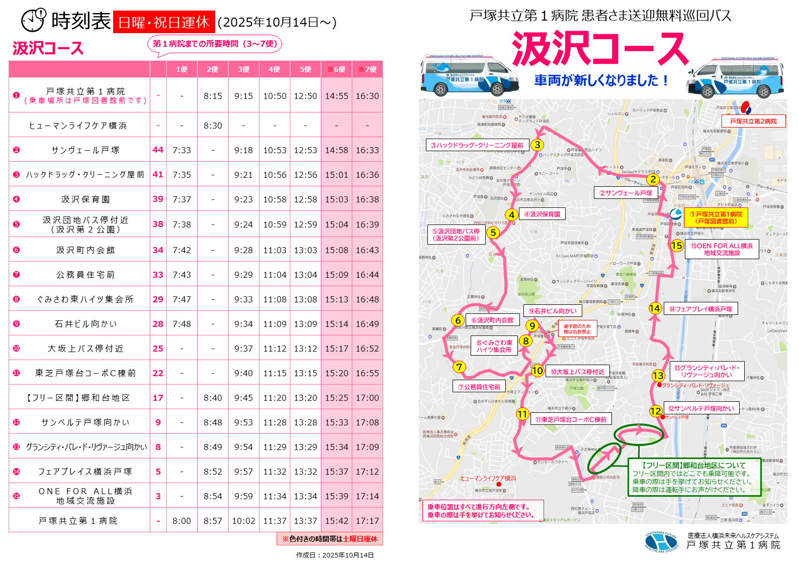 巡回コースは汲沢コース、鳥が丘コース、戸塚共立第1病院~戸塚共立第2病院(往復便)です。受診の際の足として有効活用して頂ければ幸いです。